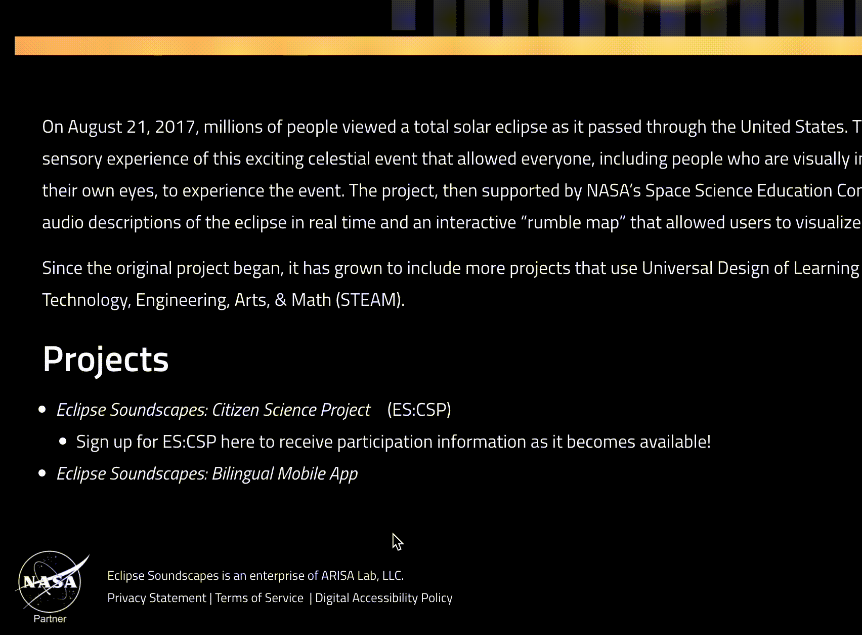 Eclipse Soundscapes Citizen Science Project (ES:CSP) is a NASA-partnered and funded project that aims to enable the Blind/Low Vision community to listen, interact, and analyze audio recordings from the 2023 eclipse on mobile app. The website on the other hand, aims to provide sufficient project information for people to get involved and provide research data from observing eclipse.