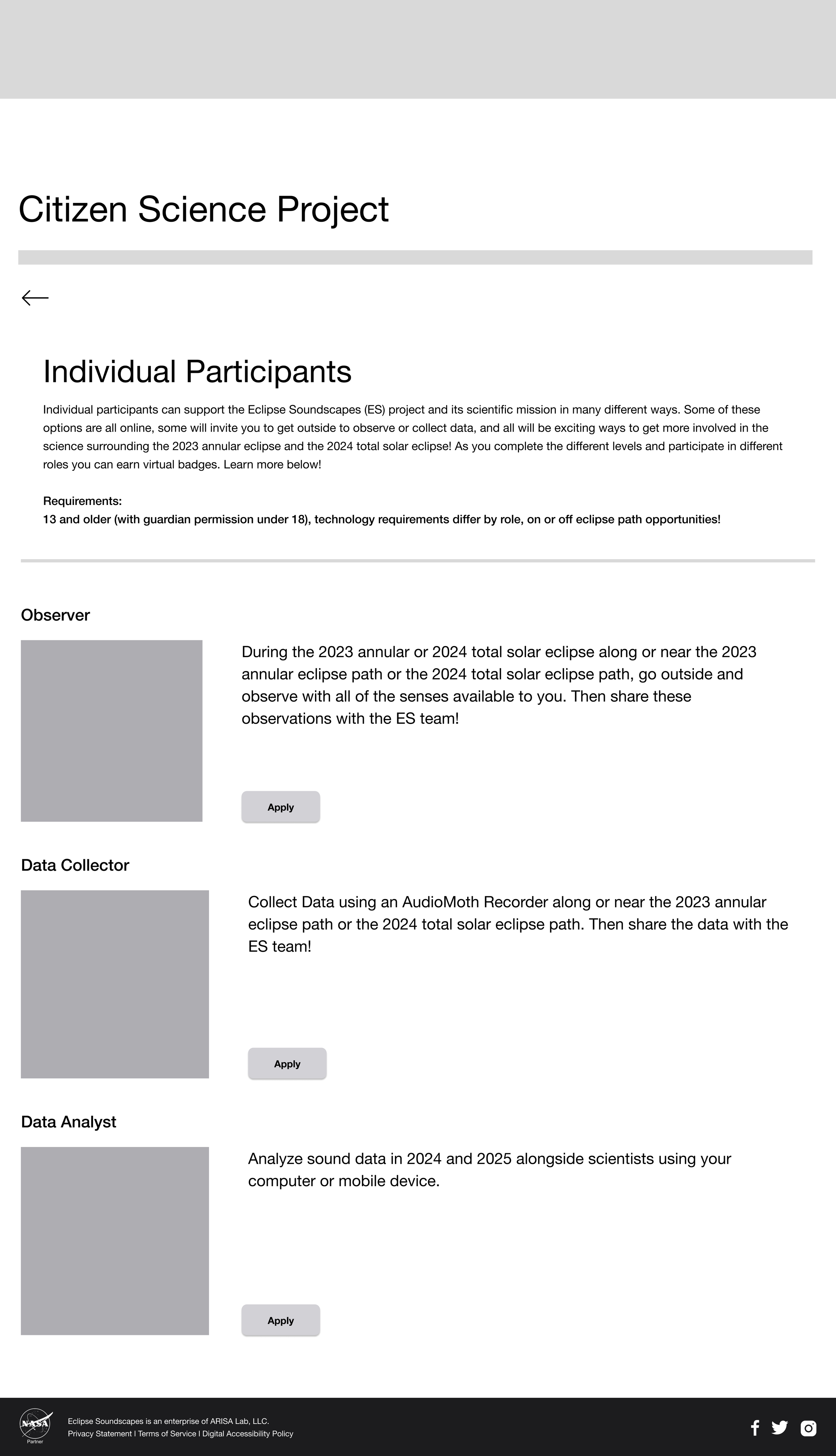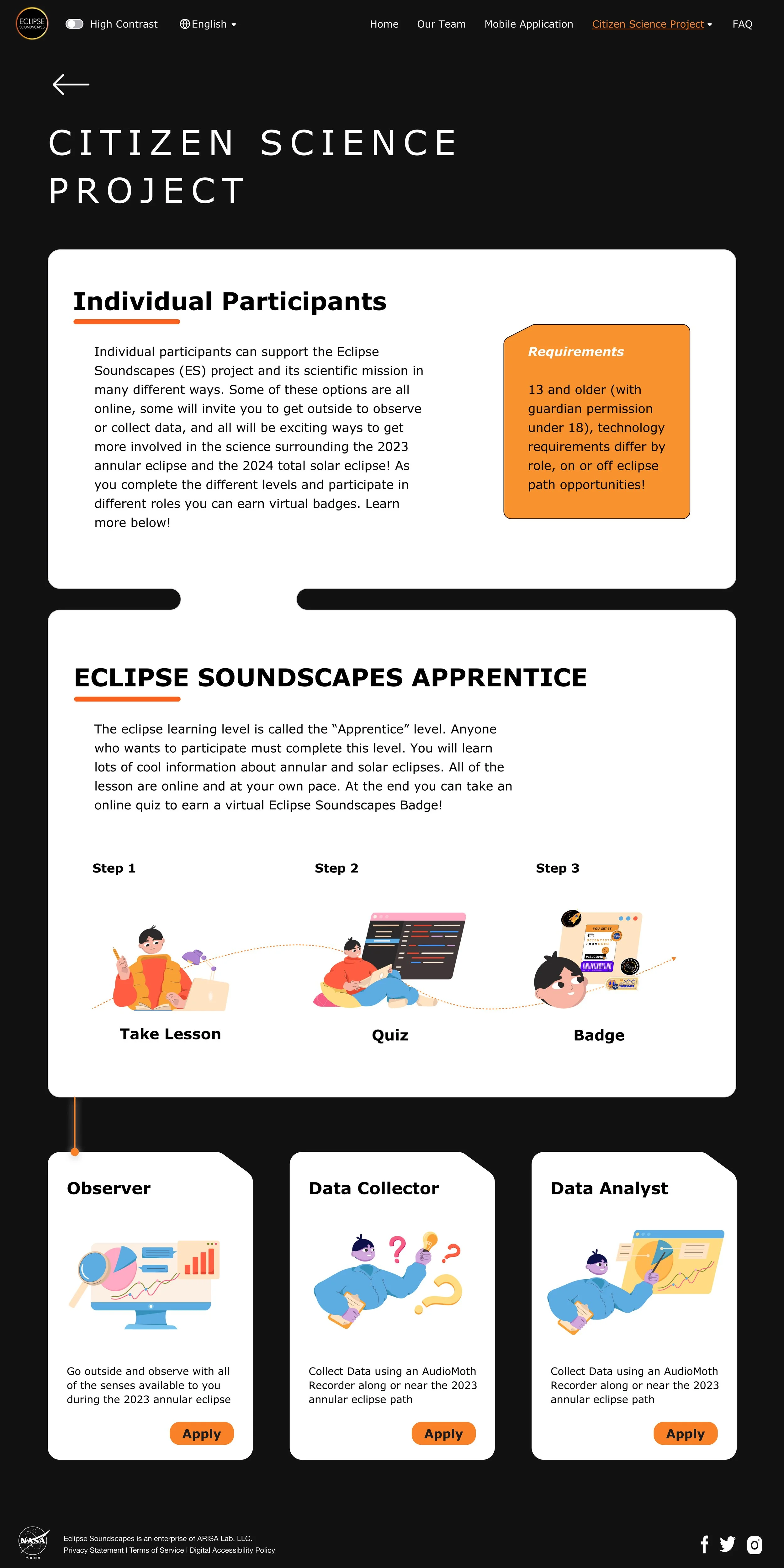 The Eclipse Soundscapes: Citizen Science Project (ES:CSP) is a NASA funded project that studies how eclipses affect life on Earth. Our client, ARISA Lab is hoping to recruit project volunteers (AKA Citizen Scientists) to help collect and analyze observations and sound data from the Eclipse events in 2023, 2024, and 2025.
