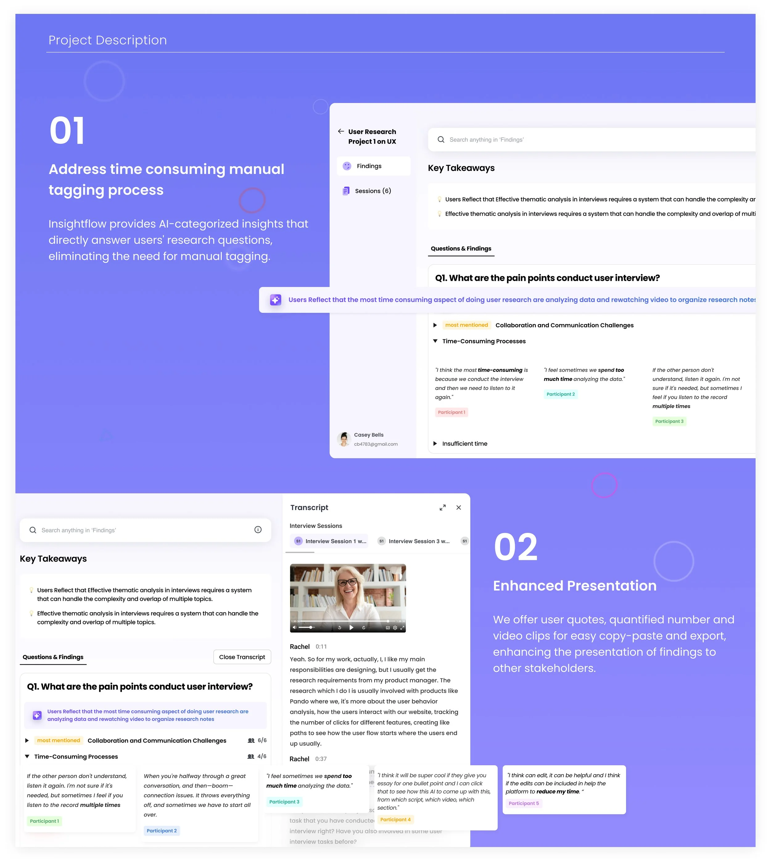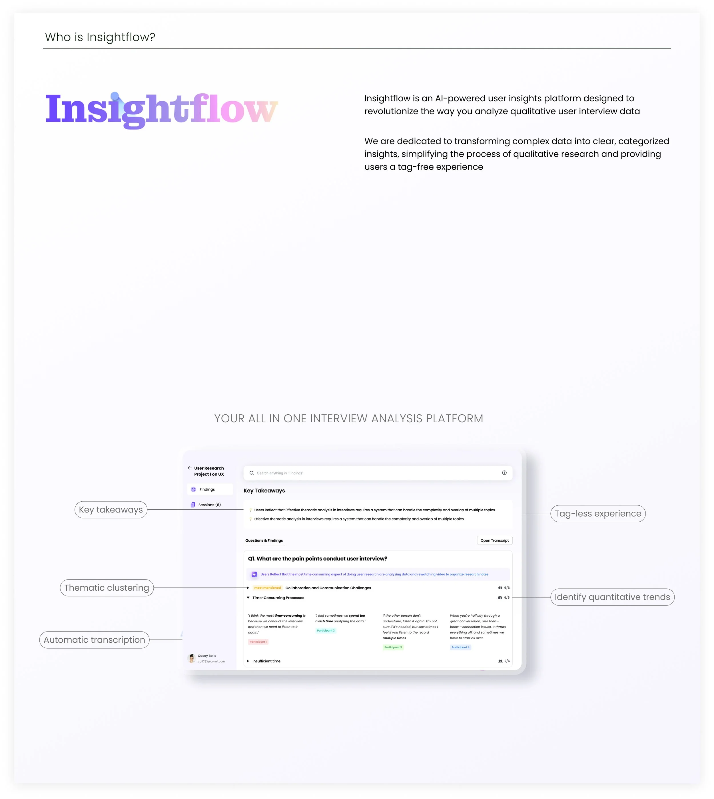 Insightflow is an award-winning AI-powered user insights platform designed to revolutionize the way you analyze qualitative user interview data. With just a simple click, Insightflow transforms all your user interviews into categorized themes and ready-to-present reports.